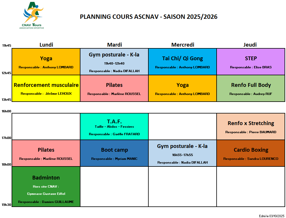 Planning des activités - Saison 2025/2026
